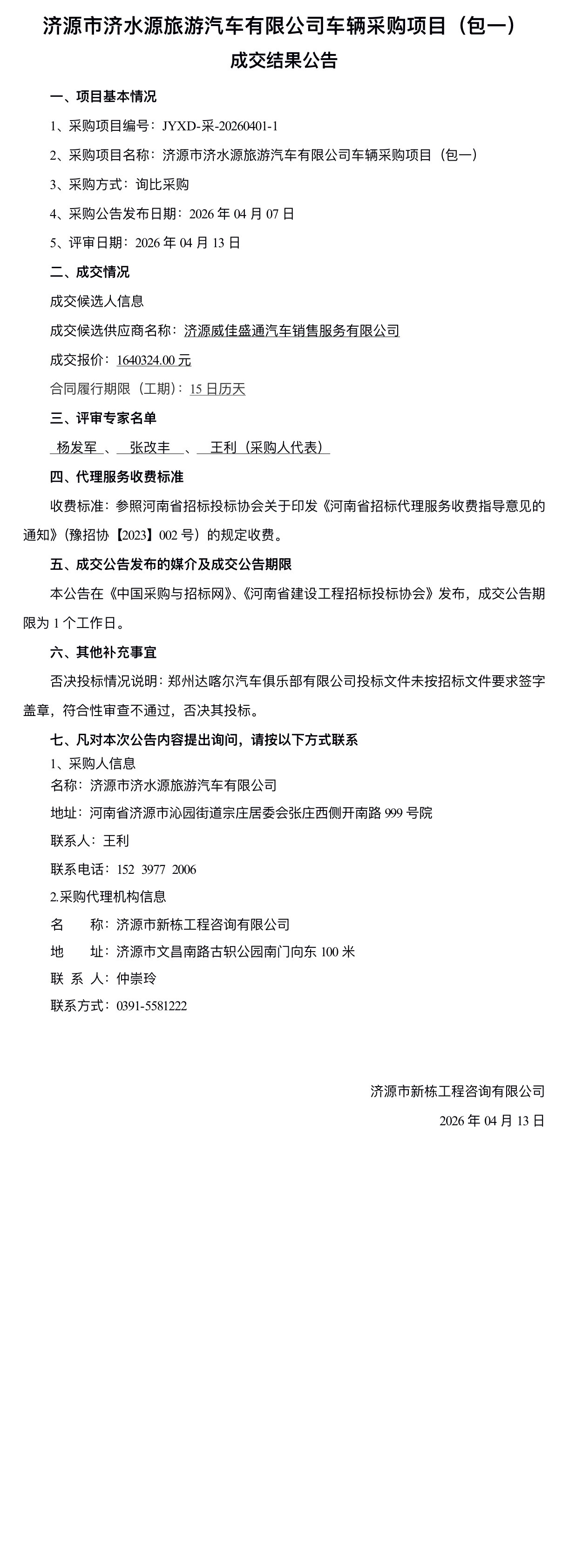 济源市济水源旅游汽车有限公司车辆采购项目(包一)成交结果公告